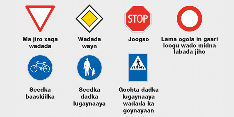 Calaamadaha ayaa muujinaaya cida leh xaqa wadada iyo meesha aad gaariga ku wadi karto. Waxay sidoo kale muujinayaan khataraga jiri kara.