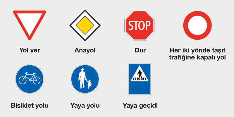 İşaretler, kimin geçiş hakkına sahip olduğunu ve nerede araç kullanmanıza izin verildiğini gösterir. Aynı zamanda tehlikelere de dikkat çekerler.