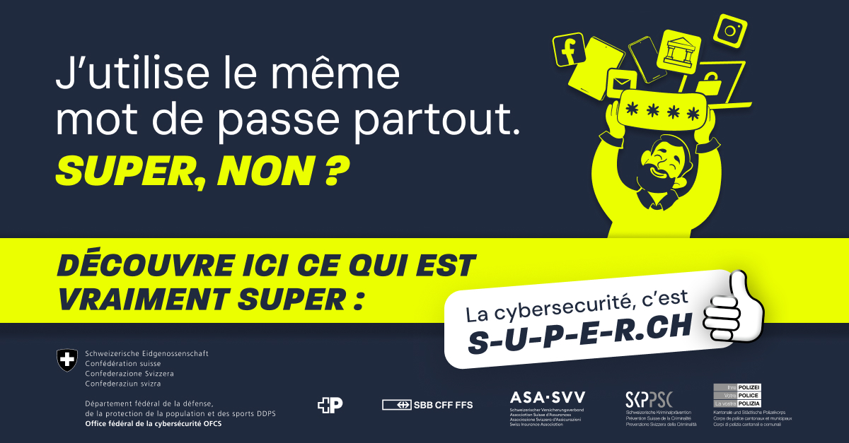 Avec cette septième édition de la campagne nationale « S-U-P-E-R.ch », réalisée en partenariat avec l’agence Partner & Partner, l’OFCS poursuit sa collaboration avec la PSC, les corps de police cantonaux et municipaux, les CFF, la Poste et l’ASA. La première campagne présentait cinq mesures importantes en matière de cybersécurité, qui correspondaient chacune à une lettre du mot SUPER. Les campagnes suivantes ont permis d’approfondir les connaissances liées à ces cinq étapes. L’année passée, l’accent était mis sur la mise en pratique, sous la devise « Pas d’excuses, de l’action ! ». Du 13 avril au 10 mai 2026, la nouvelle campagne encouragera le public à mettre en œuvre les connaissances acquises et à rester vigilant.