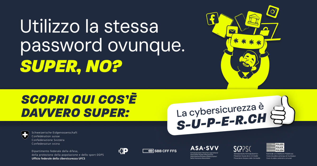 In questa settima edizione della campagna nazionale «S-U-P-E-R.ch», realizzata in collaborazione con l’agenzia Partner & Partner, l’UFCS collabora, come l’anno scorso, con la PSC e le polizie cantonali e comunali, le FFS, la Posta Svizzera e l’ASA. La prima campagna illustrava cinque importanti misure di cibersicurezza, con ogni lettera di SUPER a rappresentare un passo. Le campagne successive hanno approfondito la conoscenza delle rispettive fasi. L’anno scorso il tema «Fatelo. Niente scuse!», si concentrava sull’attuazione delle misure. La campagna attuale mira ad applicare le conoscenze acquisite e a mantenere alta la vigilanza. La campagna inizia il 13 aprile e termina il 10 maggio 2026.